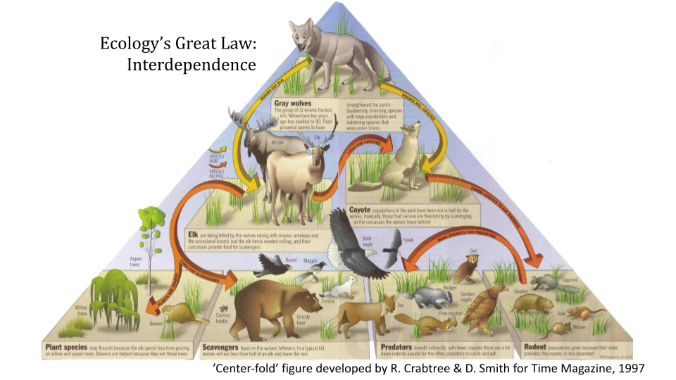 I grew up in north Idaho and first started working in Yellowstone after the great fires of 1988. I built a wolf population model that accounted for social class and family structure as part of the enormous environmental impact statement (EIS) process in 1991. This had not been done before and a highly social species needs that approach and I have been studying wolves and their ecological impacts ever since. This kind of science was also used to make the predictions illustrated in this cartoon used by thousands of teachers and students across the US.